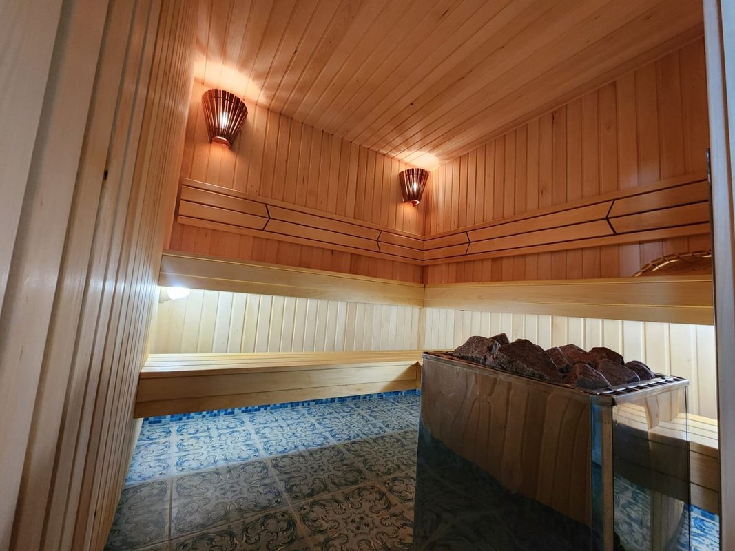 Хорошая сауна, все что было заявлено в номере - все соответствует. Но сам номер не очень большой, думали, будет больше. Бассейн теплый.